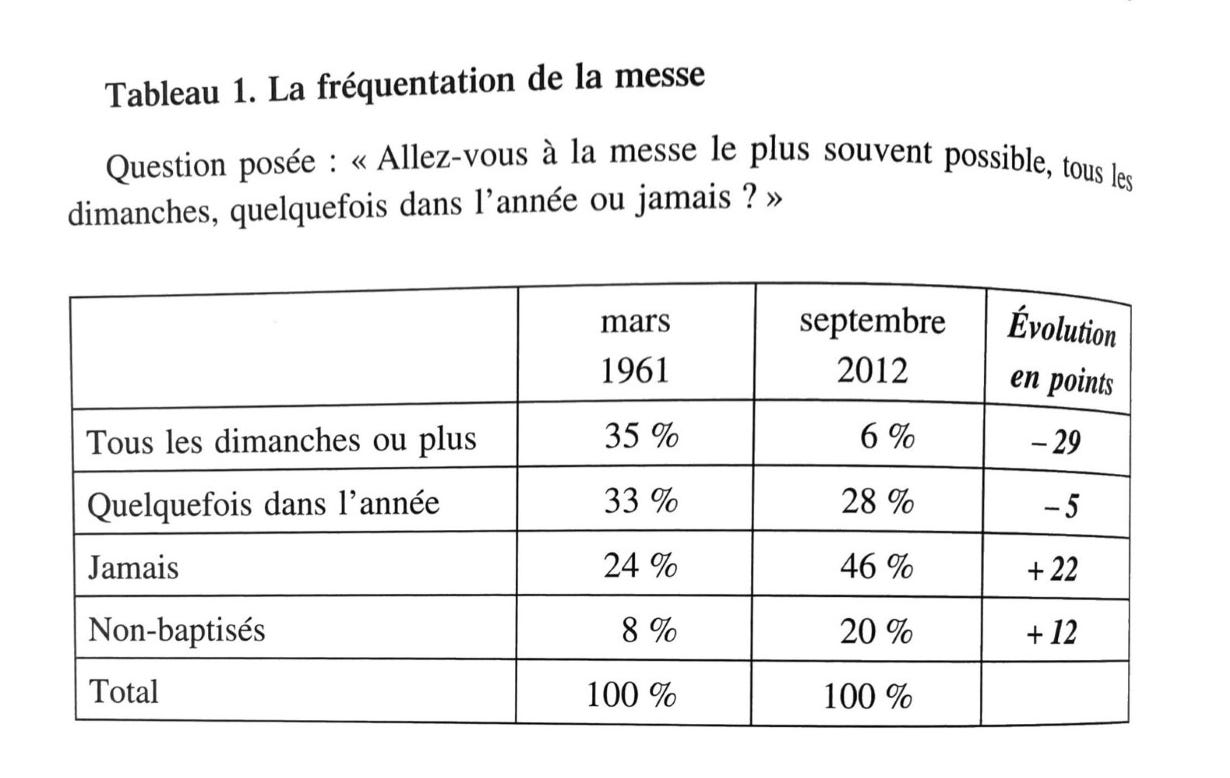 In poche parole, si passa da una norma sociale quasi implicita a una scelta di poco più di metà della popolazione. Aggiungiamo un altro tassello: nel 1961, il 35% dei francesi battezzati dichiarava di andare a messa almeno una volta alla settimana; questo dato scende al 6% nel 2012.