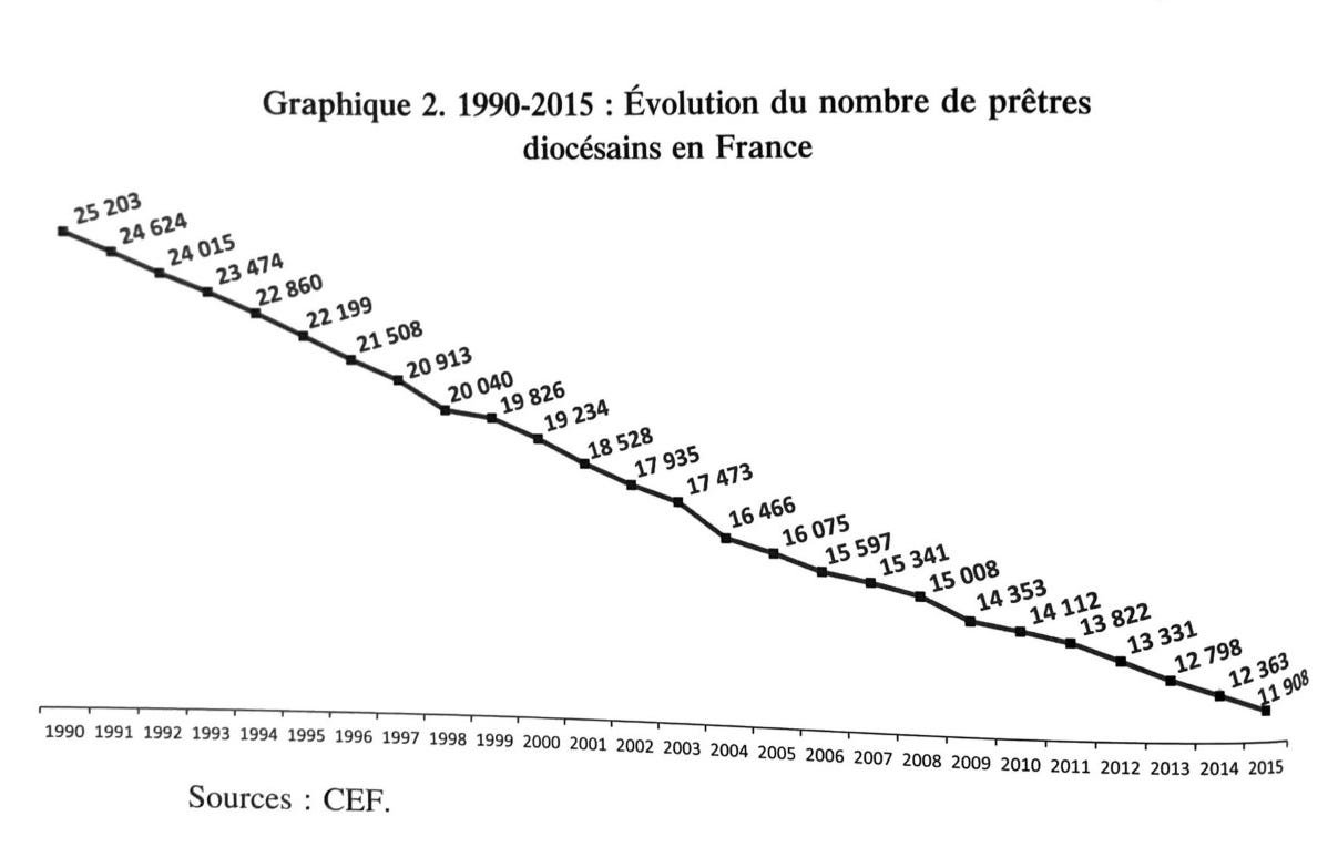 Come è facilmente intuibile, il fenomeno di “scristianizzazione” ha delle conseguenze anche sulla presenza territoriale della Chiesa come istituzione. Negli anni ’50 e ’60 del Novecento, la Chiesa aveva un radicamento simile a quello dello Stato, facilmente riscontrabile nelle numerosissime cappelle, parrocchie e chiese in ogni comune. La presenza capillare consentiva una grande presa sociale, anche questa immutata nei secoli: il numero di preti, religiosi e suore del 1789 (170mila) era pressoché identico nel 1950 (177mila). Oggi il numero dei preti diocesani, cioè la parte del clero che si occupa di gestire le parrocchie, è in caduta libera.
