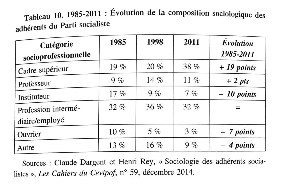 Questo fenomeno ha molteplici cause, tra cui la gentrificazione – a Parigi la percentuale di quadri superiori (i lavoratori con mansioni elevate) residenti passa dal 24,7% del 1982 al 46,4% del 2013, fenomeni simili si notano a Bordeaux, Nantes, Strasburgo e Tolosa –, la fine del servizio militare obbligatorio per tutti, un impegno sempre maggiore nei partiti dei più ricchi e istruiti. Osservate quanto aumenta la percentuale dei quadri superiori tra i militanti del partito socialista tra il 1985 e il 2011, poco prima di andare al potere con François Hollande.