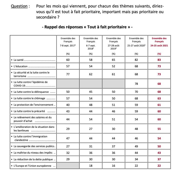 Quasi due anni di pandemia hanno avuto un effetto evidente sulle paure dei francesi: tutti i temi citati dal sondaggio, che chiede quali siano le priorità da affrontare nei prossimi mesi, crescono. E quindi per i diversi candidati sarà più difficile affrontarli in modo coerente: l’arcipelago si aspetta più attenzione, accontentare e blandire tutte le isole sarà impossibile.